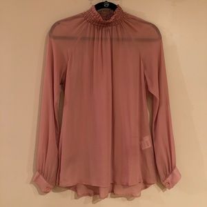 "This is a sheer, high neck top with smocking at the neck." 100% viscose.