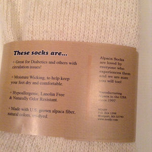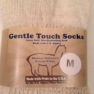 NWT Slightly imperfect socks. Imperfections are only in small color or knit variations, but do not effect the integrity. Gentle Touch Socks are made in the US with the finest US grown alpaca fiber. Designed with those in mind who have circulation issues from such conditions as diabetes, Raynaud's syndrome, neuropathy or swelling in the ankles. 78% Alpaca, 17% Nylon, and 5% Lycra - Machine wash cold. Tumble dry low. Sock sizes (Based on Men Shoe Sizes): Medium (7-10)
