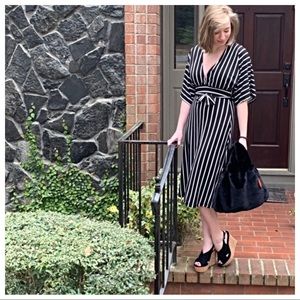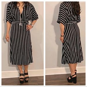 Chic black and white stripe Low V neck belted midi dress