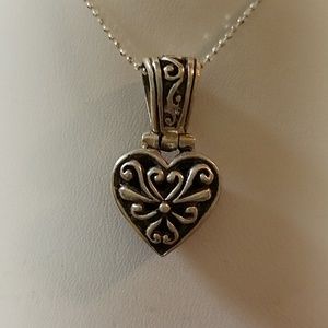 This is a fabulous necklace to have because it is a beautiful heart with black onyx on one side and on the other side it is beautiful scrollwork in sterling silver. A necklace with the sterling silver chain are almost 24 in Long.