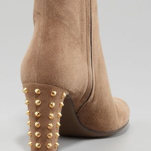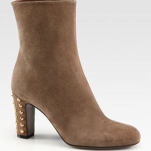 Gucci Jacquelyne Genuine Suede Ankle Boots with Gold Coned Shaped Studded Block Heels. Split toe seam with inner side zip closure. Zipper pull is "GUCCI" embossed. Worn maybe twice. Retailed at $900.00. Sorry, I do not have the box nor the dust bag. Comes from a smoke free home. Please look at all photos