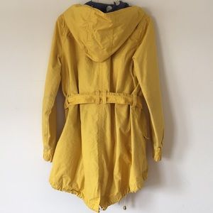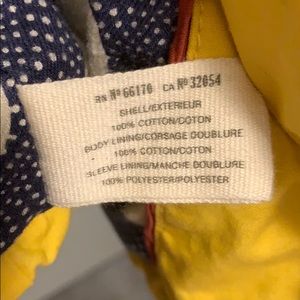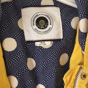 Bright yellow with blue and white polkadots inside, four pockets in the front, belted, big hood