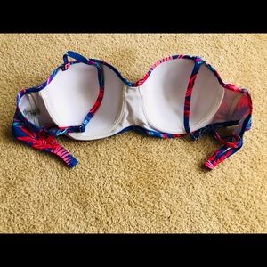 Love this bikini top but too large for me. Bought in a shop last summer at Madeira Beach Florida because it was so pretty in hopes I could make it work for me but just too large. Straps adjustable. Back clasp has three settings. Size tag says simply “E”. I’m guessing cup size. The bottom measures 39” from end to clasp. Never worn. If you are a large bust size gal, you will absolutely love this bikini top!