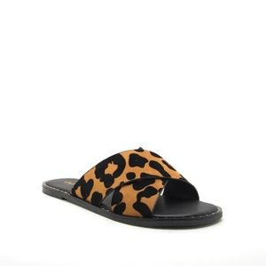 Achieve casual-chic status in slides that require zero effort. More than your average sandals, this style is designed with studs that line the trimming of the sole, a faux leather X-band, flat sole, slip-on construction, and open toe.