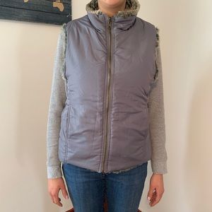 Gray and fur. Pockets on both sides. Warm and pretty. Gray side is water resistant.