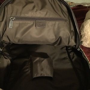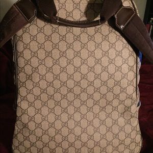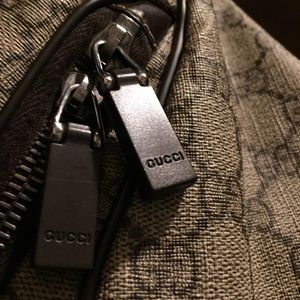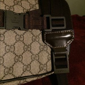 Men's beige and brown coated canvas Gucci GG Supreme Interlocking G backpack with gunmetal hardware, brown leather trim, dual flat woven shoulder straps, front zip pocket, brown interior canvas lining, two pockets at interior; one features zip closure and two-way zip-around closure at top.