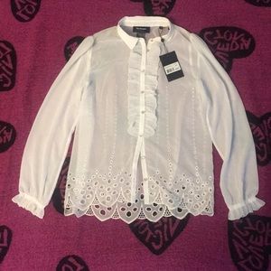 A white button up top, that isn’t stretchy. It’s very nice and has never been worn.