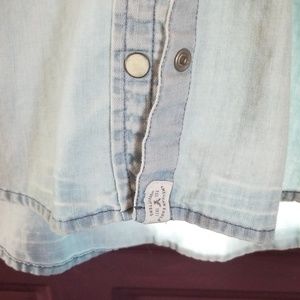 AE light blue denim shirt. Great condition with white snap closures at front and sleeves. Fits more like a Medium I would say. Slim cut. Slight stretch.