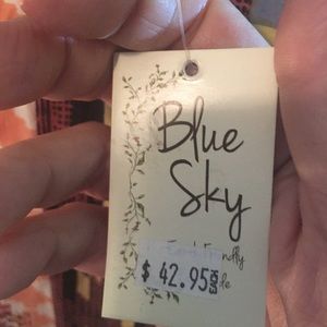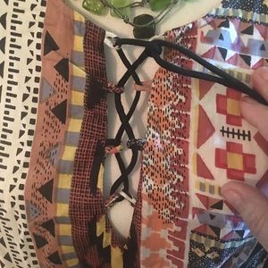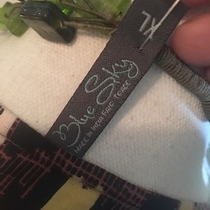 This has a lot of detail. Cute tie front, bell sleeves, black trim and a stylish print. I am 5’4” and it hits just above my knees. True XL The mannequin is a bit deceiving since she is a little small. This is a light airy and nice coverup for ladies like me who will not wear a suit in public. I wear my suit and usually a cover up like this. Can also be worn as a dress! This is new with tags. Made in India fair trade. Would even look good with skinny jeans as a tunic in the fall.BIN K