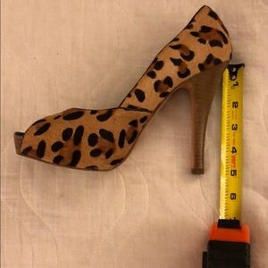 Size 9. Excellent Condition. 5-inch heel. Leopard print Calf hair. Peep toe pump. Box with no top. Stacked heel design.