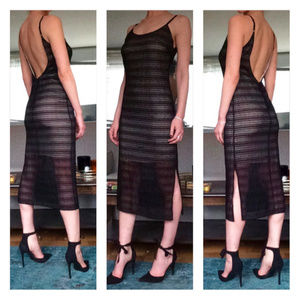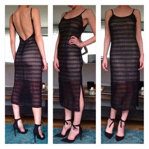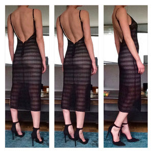 Gorgeous illusion A+O dress with delicate crochet-like overlay over nude jersey partial lining.