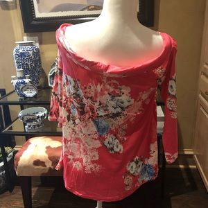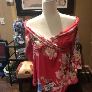 This new top is lightweight and looks like Spring! Pretty pinks and blues. Can be worn on the shoulder or off the shoulder. With tags