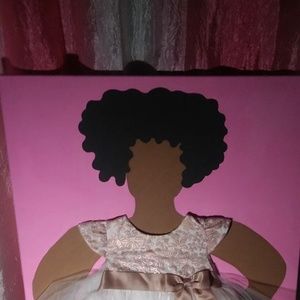 Little girl in a PINK DRESS ready to show it off ! With the most beautiful curly black hair. THE painting is 24x30 inches . Made with A REAL INFANT BABY GIRL DRESS ! GREAT wall art furnishings !
