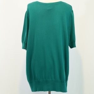 Liz & Me teal short sleeve cardigan sweater with button up front and eyelet detailing. This sweater in in Like New Condition with one flaw, a small hole on the ribbed neckline (refer to pics). Easy fix with a needle and thread. Color is much more vibrant in person.