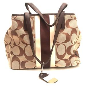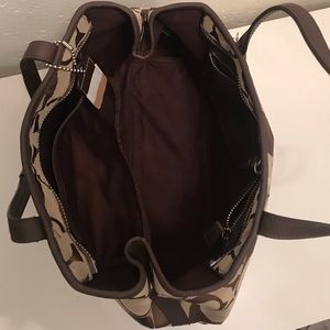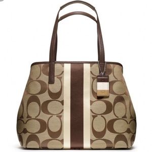 Brown Coach purse with brown and tan strip. Great condition! Used but cleaned thoroughly before selling.