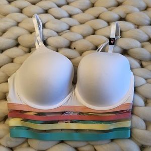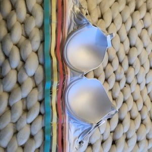Never been worn, white with multiple colors and see through slim panels. Long line bra, Demi cup/ T-shirt bra
