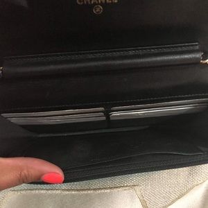 crafted of diamond quilted glossy patent leather in black. The wallet features an extra-long black leather threaded aged gold chain link shoulder strap and a front flap with linear border quilting and a Chanel CC press lock. This opens the front flap to a nylon interior with card slots, zipper, and patch pockets. This is a lovely crossbody. Includes receipt, card dustbag, tag and box.