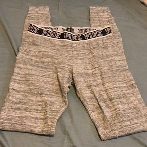 Worn 5x/ marled grey/ with silver dog logo on left side of lower leg/ cuffed legs/ waffle knit material/ wide elastic black and white “pink” logo band with slight piling on inside of waist band( you can always shave with pill machine) super comfortable and cute/ 2 white small button as decor