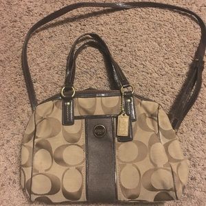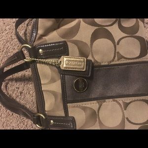 SOLD- Authentic coach purse. Such a roomy purse. Great condition. I just don’t use it. There are some wear on the long strap. Preview pictures. There is a small spot along the outside of the material. I haven’t attempted to try wiping it to see if it can be removed. But still very much stylish and fashionable.