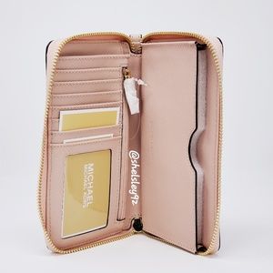 -Interior of wallet: 1 zipper pocket, 1 ID slot, 6 CC slots, 1 slip pocket, & 1 phone slip pocket.
