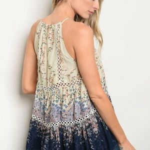 Boho chic sleeveless tank with round neckline, floral print, and crochet detail. Content: 100% rayon.