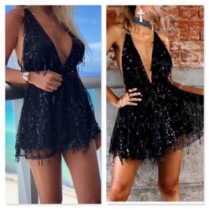 Plunging V Black Sequin Fringe Backless Mini Dress
