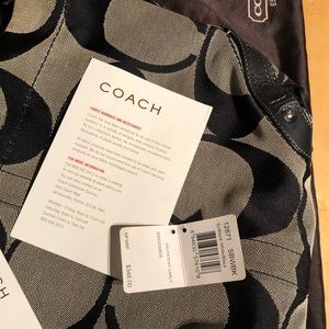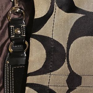 Pre-owned Coach Carly jacquard leather black and white signature hobo shoulder bag in very good condition with minimal wear. There are a couple of blemishes on the outside upper edges, see photos. Interior lining is black sateen w/ 2 slip and 1 zip pocket in excellent condition.