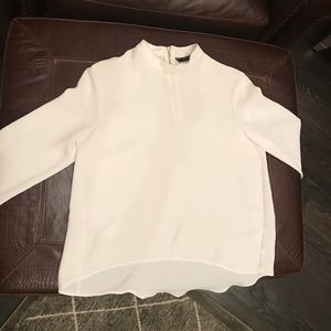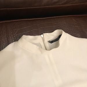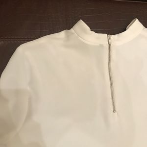 This is a very business casual blouse that works for every interview, audition, or professional meeting. This has a silky material and a little quarter-zip at the neck! This is a little see-through and I would recommend wearing a tank top under!