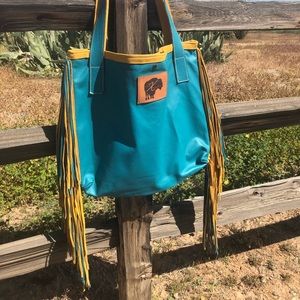 Long X Trading Co. soft Turquoise & Mustard Leather & Fringe with Native Wool Front Purse. Snap closure, 2 inside-side pockets. Approx. 19 1/2โ x 17 1/2โ. Cost $795
