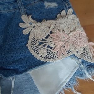 Zara Distressed Crochet Denim Cutoff Shorts Size 4. Excellent used condition(EUC). So cute! Very distressed! Pink and white crochet design on the front and back of the shorts.