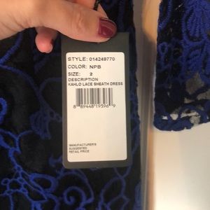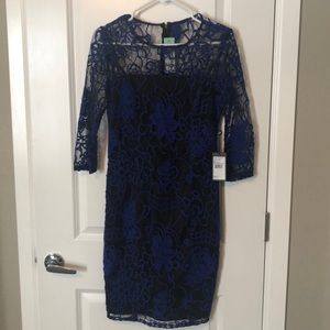 Vibrant blue kahlo lace sits atop a black underlay, and features illusion sleeves and neckline. Size 2. 3/4 length sleeves. Absolutely beautiful dress - never worn!