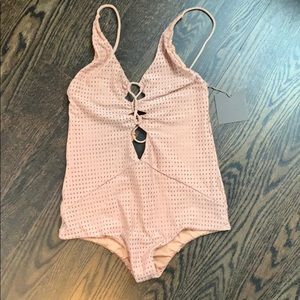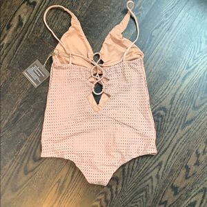 The ACACIA Kokomo mesh one piece features cut out and strappy detailing on the front and back. Barefoot mesh color.