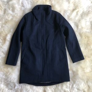 Excellent preworn condition. General wear/may require a spot cleaning. Breathable wool. Relaxed silhouette. Structurred topper and funnel neck. Signature glacier stripe lining. Concealed front snap closures and concealed zip closure. Two side slit pockets. Zip pocket at right sleeve. True to size. Approx: bust 21” across, length 33”-34.5”. Offers welcome through offer tab. No trades. 10304191251C3