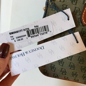 Convertible satchel or crossbody purse. Woven D&B logo fabric (ivy color) with leather trim, top zipper closure and detachable shoulder strap for extra versatility. Two inside pockets keep items handy and also one inside zip pocket. Beautiful red lining.