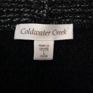 This listing is for a Coldwater Creek sweater top. This is a women’s size large (14-16). This sweater features a cowl neck, dolman sleeves, and a thick knit. The colors are black, white, and gray. This is in excellent used condition! So cozy, and perfect for chilly days!