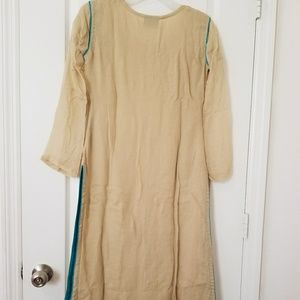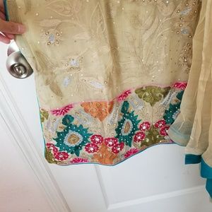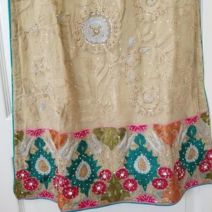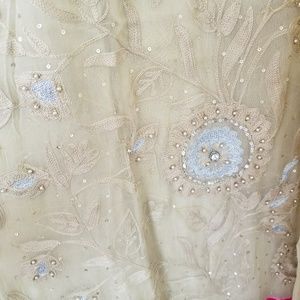 Full of delicate thread and beads embroidery and stone work, this is a fancy chiffon kameez with matching dupatta and straight pants. From Mona's by Ally's Pakistan. Tag size says Small but it fits like XS. Bust 17 inches. Very good condition. Half sleeves lined.