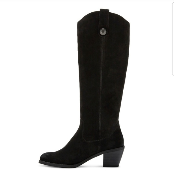 Genuine Suede Leather in black adds a luxe touch - Thick 2-inch heel adds stability - Hits just below the knee Beautifully crafted and endlessly versatile. Suede Leather Pull On Boots are made from genuine leather for major durability. The slight western style adds a dash of cowgirl flair to any outfit. Calf circumference 14"