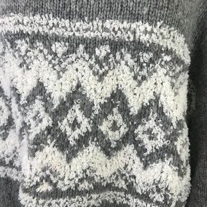 Features: Super chunky, cowl, button style neck, really soft wool blend, Faire Isle Print, Dolman Sleeve, grey & white color