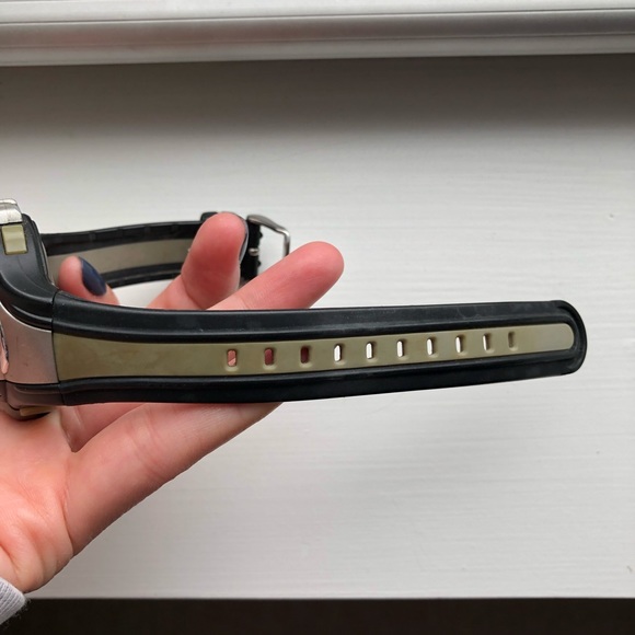 Vintage black, matte silver and gray Men’s Golf sport watch from Nelsonic. Battery not included. The watch has a black and gray rubber watchband strap with a buckle clasp. The strap measures 9 inches by .75 inches. Black & silver case with silver tone bezel - the case measures 2 inches by 2 inches. Digital display. Stainless steel back. Water resistant. Some normal wear with use over time, but in great vintage condition with a lot of life left in it!
