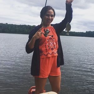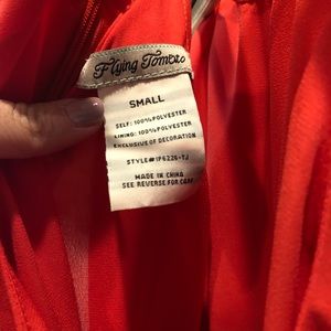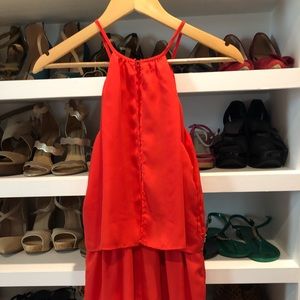 Size small. In excellent used condition. Adorable bright coral chiffon romper with white blue and black embroidery on bust. Ruffled bust. Halter style neckline. Elastic waist. Bust 17", waist (not stretched) 12", hips 19", length 31".