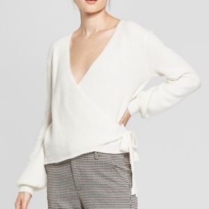 Soft knit stretchy fabric. Long sleeves that are fitted on the wrists. Fo- wrap style with fairly long tie on left side. Deep V neck. Slightly sheer. Will fit a medium