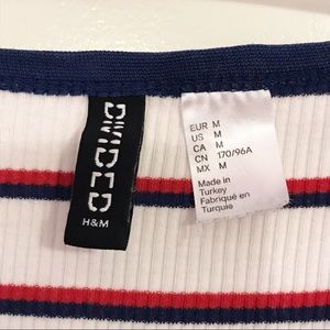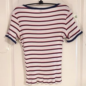 This Divided essential ribbed knit tee has a scoop neck, and flattering short sleeves🧚🏻♀️ The horizontal stripes are blue and red, and the neckline and sleeves have blue trim🧚🏻♀️ This top shines with denim bottoms of your preference🧚🏻♀️Size Medium, very stretchy🧚🏻♀️