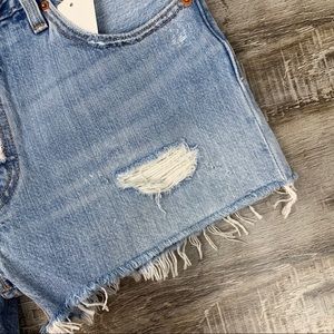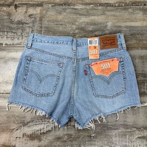 Levi’s 501 Shorts. Shredded frayed raw hem. Light distressed wash called North Beach Noise. Mid rise. Button fly. 100% cotton no stretch. Vintage vibes.
