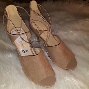 Open toe sandals, suede & leather, worn to car and removed 1x ( too high).......9 1/2m. Nice shoes