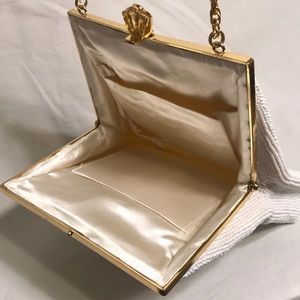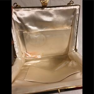 Hand-made womenβs clutch designed beautifully with gilded gold hardware and chain and ivory satin lining. Highly collectible. Made in Japan. In pristine condition.