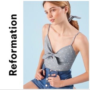 Keep them all tongue tied with this cute little Reformation top with a twist front detail. This is an easy fitting top with a center front tie, adjustable straps and an open upper back.