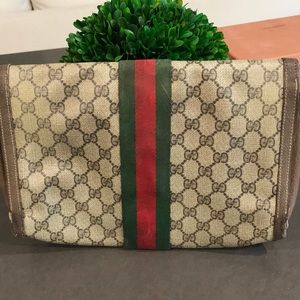 Gucci vintage clutch purse. 100% authentic, 100% pre-loved and cherished. Would need to be taken to someone that knew how to care, clean and restore the bottom corners stitching. Bag has been stored in a dust bag and not carried in 20 years.