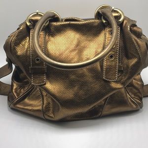 Beautiful bronze color genuine leather bag. The leather is so soft. It has two pockets on the inside plus a large zipper pocket. 14x6x11. It has a little wear on the bottom of the bag
