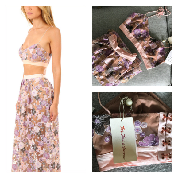 A sweetheart bralette perfectly composed of delicate tulle with delightful floral embroidery. Finished with barely there satin self tie straps and exaggerated hook and eye closures.