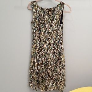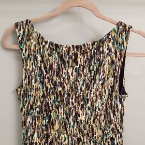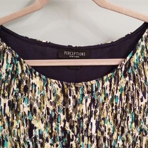 Green, cream, black and teal sleeveless dress from Perceptions in a size small. 92% polyester and 8% spandex.